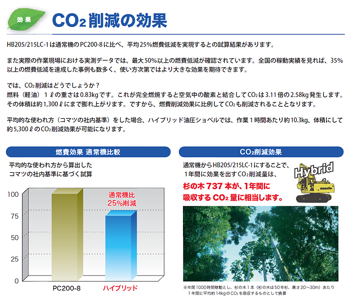 環境負荷低減型重機の導入 環境負荷低減型の重機を導入することにより、Co2排出量の削減に取り組んでいます。 (コマツ ハイブリッド油圧ショベルパンフレットより引用) ハイブリッド油圧ショベル パンフレット ダウンロード (PDF:1.59MB)