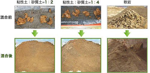 従来工法では混合が難しかった粘性土も軟岩も均質に混合することができます。粘土塊は細かく解きほぐし、軟岩は細かく破砕して混合するので、安定した品質の土砂を製造できます。