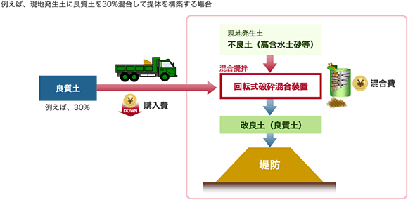 回転式破砕混合工法は、従来工法に比べて土砂の適用範囲が広いため、従来工法では改良が難しかった土砂も均質に混合できます。その結果、これまでは場外処分していた建設発生土の有効利用が図れるため、環境負荷の低減、工事費事業費コストの削減が可能です。