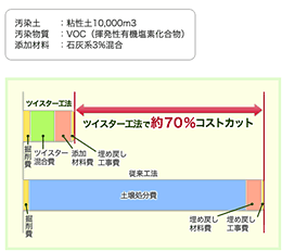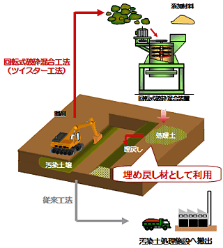 回転式破砕混合工法(ツイスター工法)は砂質土のみならず粘性土も浄化できます。