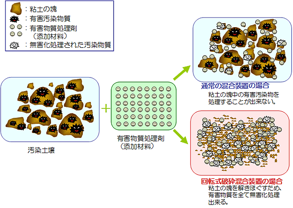 土壌を細かくしないで有害物質処理剤を混合すると塊の中に有害物質が残ります。